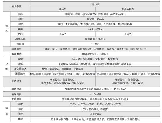 技術(shù)要求:輸入三相電壓AC220V;輸入電流AC5A;投切方式順序投切;補(bǔ)償方式三相共補(bǔ);投切控制路數(shù)6路;開關(guān)量輸入6路;柜內(nèi)溫度檢測。