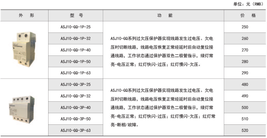 產(chǎn)品簡介:ASJ10-GQ系列自復(fù)式過欠壓保護(hù)器(以下簡稱ASJ),適用于單相交流電壓230V或三相電壓400V,頻率50Hz,額定工作電流至63A及以下的用戶或負(fù)載。由中性線故障引起的單相或三相線路過、欠電壓時,保護(hù)器對用電設(shè)備進(jìn)行保護(hù)。