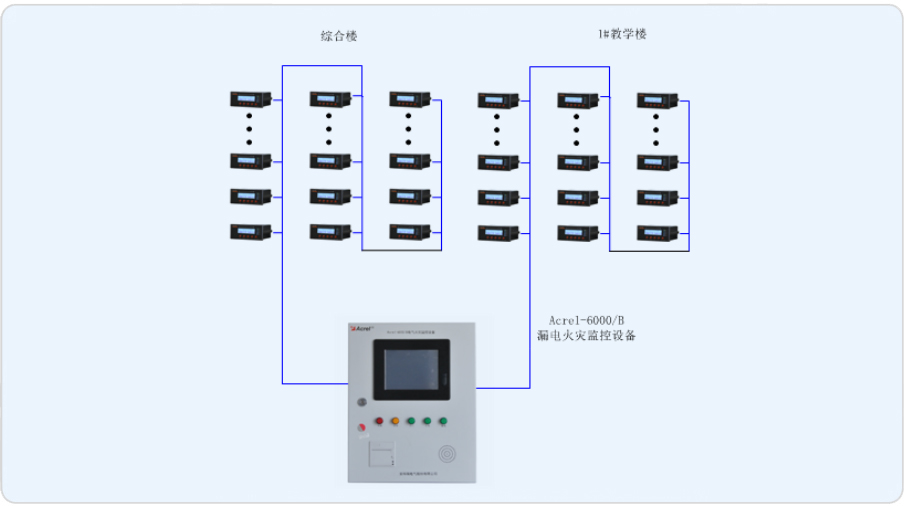 本項(xiàng)目主要是針對上海復(fù)旦高等藝術(shù)實(shí)訓(xùn)基地內(nèi)的兩棟教學(xué)樓設(shè)計(jì)電氣火災(zāi)監(jiān)控系統(tǒng)。在部分樓層配電柜的重要回路安裝安科瑞研發(fā)的ARCM系列剩余電流式電氣火災(zāi)監(jiān)控探測器,并為其配置一套Acrel-6000/B電氣火災(zāi)監(jiān)控系統(tǒng),電氣火災(zāi)監(jiān)控系統(tǒng)實(shí)時監(jiān)測重要回路的剩余電流值、箱體回路的實(shí)時溫度,監(jiān)測的數(shù)據(jù)實(shí)時傳輸至后臺主機(jī),當(dāng)發(fā)生剩余電流值越限、溫度越限時,后臺能進(jìn)行聲光報警,同時后臺能夠和消防火災(zāi)報警系統(tǒng)實(shí)現(xiàn)消防聯(lián)動。