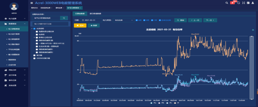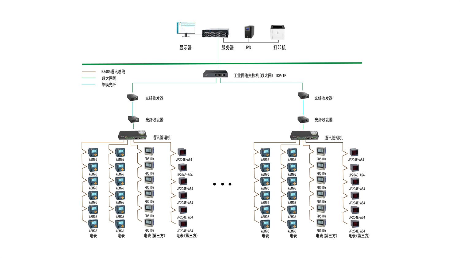 本項目電壓等級包含35kV、10kV及04kV,共安裝628只多功能數顯儀表,14只溫控儀。實現各回路及設備實時在線監(jiān)測、故障報警、用能統(tǒng)計、能效分析等功能。