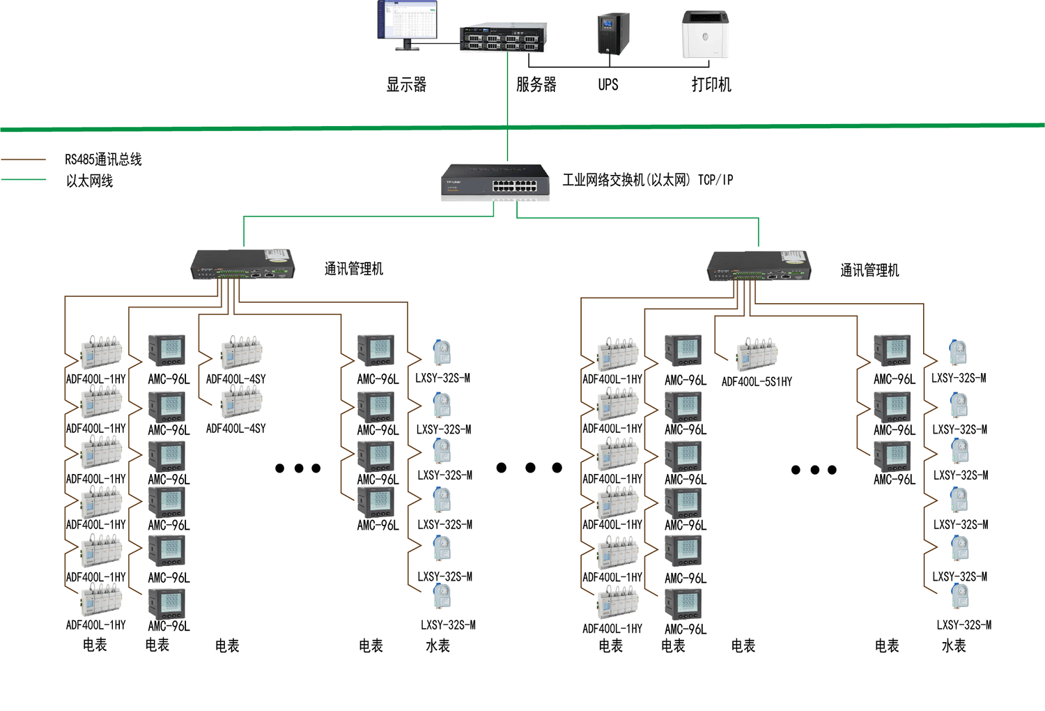 該項(xiàng)目現(xiàn)場(chǎng)設(shè)備層儀器儀表共計(jì)ADF400L各系列電表共計(jì)56塊,AMC96L電表56塊,水表93塊。四個(gè)采集箱安裝在負(fù)一層,所有電表水表通訊線(xiàn)在負(fù)一層連接到采集箱。