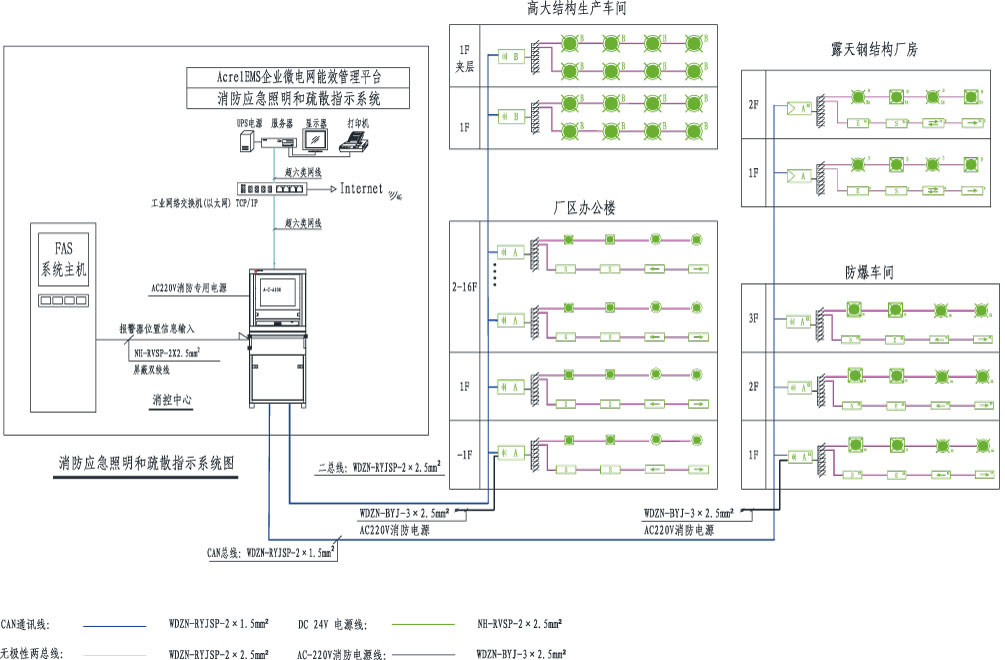 消防應(yīng)急照明和疏散指示系統(tǒng)主要由應(yīng)急照明控制器、消防應(yīng)急照明集中電源或應(yīng)急照明配電箱、消防應(yīng)急燈具等幾部分組成。該套系統(tǒng)符合國(guó)家現(xiàn)行的行業(yè)規(guī)范,可以滿足與AcrelEMS企業(yè)微電網(wǎng)管理云平臺(tái)或火災(zāi)自動(dòng)報(bào)警系統(tǒng)等進(jìn)行數(shù)據(jù)交換和共享。