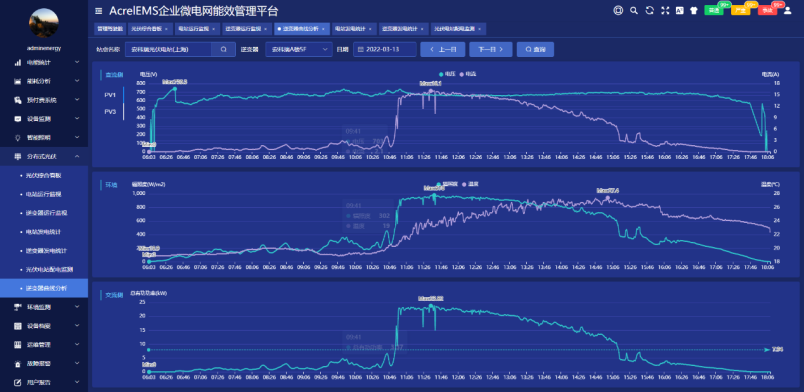 展示逆變器直流側(cè)電壓、電流曲線,交流側(cè)功率曲線以及環(huán)境輻照度曲線、溫度曲線。便于用戶進行整體分析。