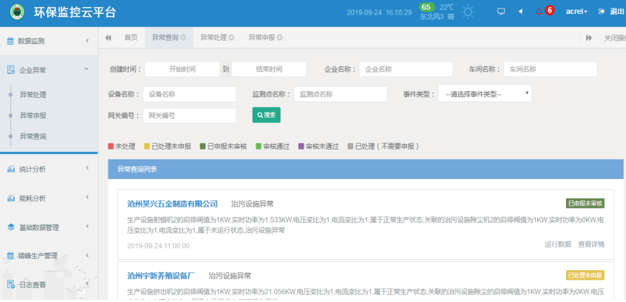 企業(yè)運行狀態(tài)統(tǒng)計:按年/月/日統(tǒng)計分析企業(yè)、監(jiān)測點、產(chǎn)污設(shè)施、治污設(shè)施等異常產(chǎn)生的情況。