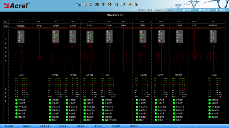 系統(tǒng)人機(jī)界面友好,以配電一次圖的形式直觀顯示配電線(xiàn)路的運(yùn)行狀態(tài),實(shí)時(shí)監(jiān)測(cè)各回路電壓、電流、功率、功率因數(shù)、電能等電參數(shù)信息,動(dòng)態(tài)監(jiān)視各配電回路斷路器、隔離開(kāi)關(guān)、地刀等合、分狀態(tài),以及有關(guān)故障、告警等信號(hào)。