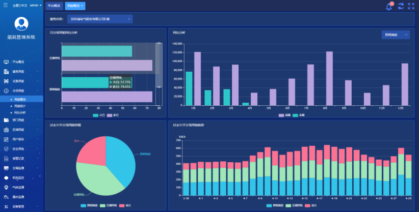 提供能耗分析報(bào)告功能,從多個維度統(tǒng)計(jì)分析用戶能耗使用情況。報(bào)告可以提供同環(huán)比分析、復(fù)費(fèi)率電量和電費(fèi)分析、能耗排名分析、報(bào)警情況統(tǒng)計(jì)等功能。