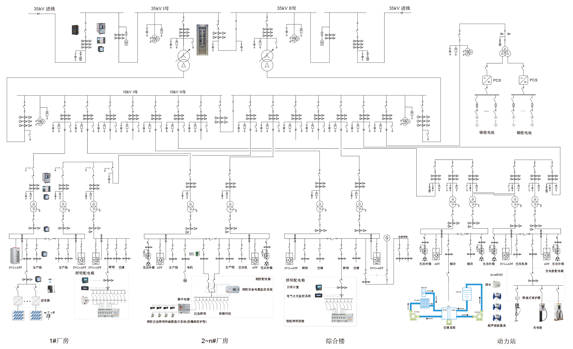 電力監(jiān)控系統(tǒng)實(shí)現(xiàn)對(duì)園區(qū)變電站、配電房?jī)?nèi)斷路器、變壓器、柴油發(fā)電機(jī)以及其它重要設(shè)備進(jìn)行監(jiān)視、測(cè)量、記錄、報(bào)警等功能,并與保護(hù)設(shè)備和遠(yuǎn)方控制中心及其他設(shè)備通信,實(shí)時(shí)掌握?qǐng)@區(qū)變電站和配電房運(yùn)行狀況,快速排除故障,保障園區(qū)供電可靠性。