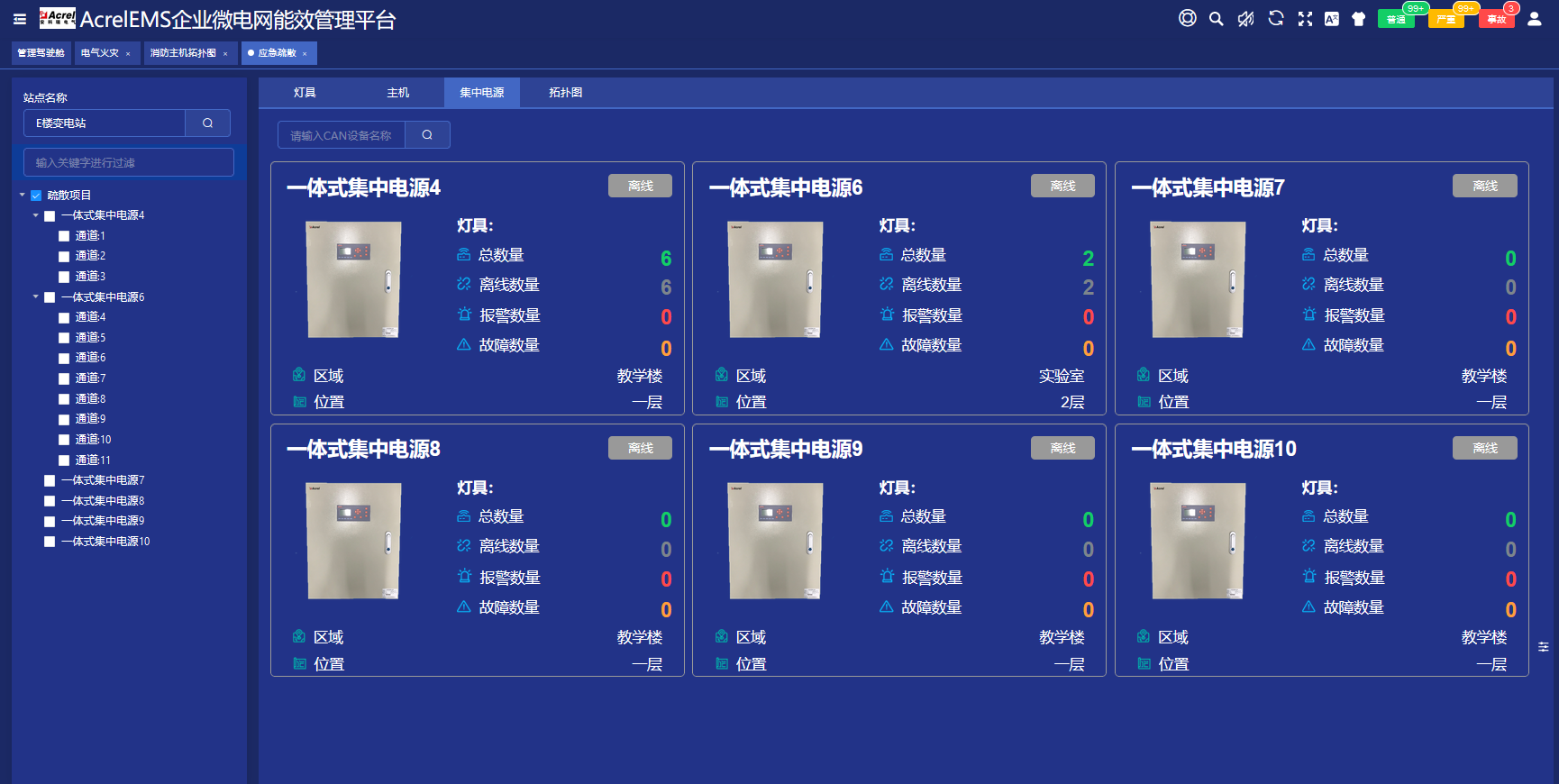 應(yīng)急照明集中電源是安裝在建筑物內(nèi)的備用集中式集中電源裝置。集中電源可以為消防標(biāo)志燈、照明燈供電,保證消防應(yīng)急照明和疏散指示系統(tǒng)正常工作,軟件可分布式顯示現(xiàn)場實(shí)際集中電源各類信息和狀態(tài)。