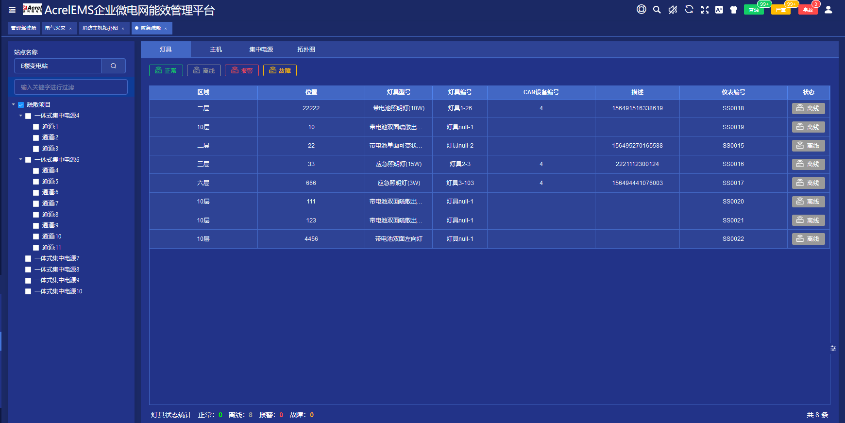消防應(yīng)急標(biāo)志燈具的主要作用是為人員疏散指引方向,消防應(yīng)急照明燈具的主要作用是為人員疏散逃生提供照明,軟件可實(shí)時(shí)顯示現(xiàn)場燈具的狀態(tài)信息。
