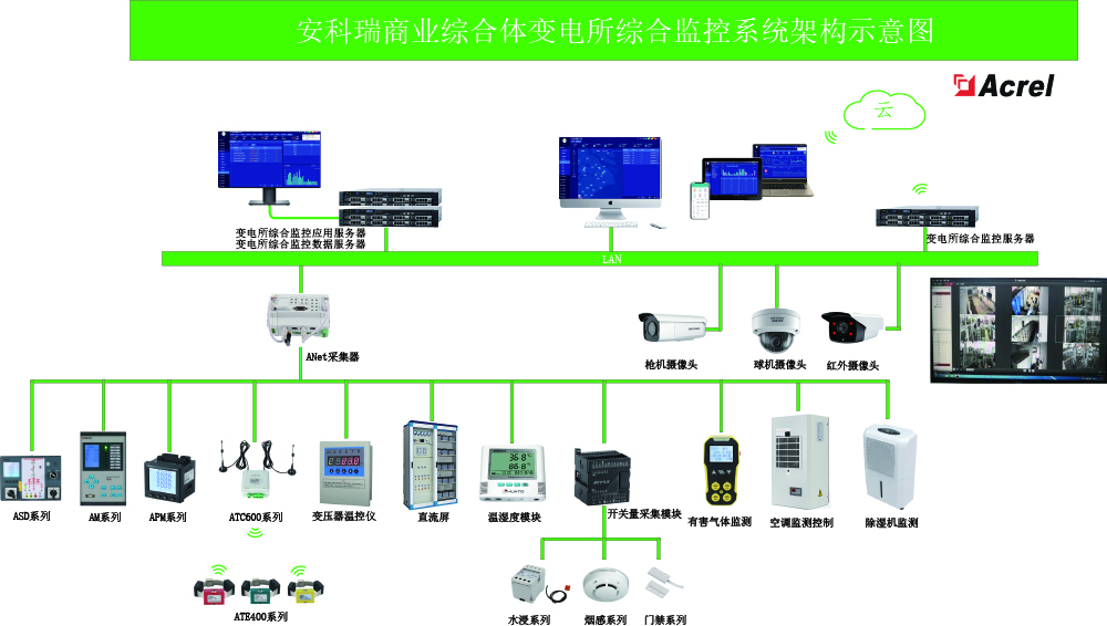 Acrel-2000E配電室綜合監(jiān)控系統(tǒng),可實現(xiàn)開關(guān)柜運行監(jiān)控、高壓開關(guān)柜帶電顯示、母線及電纜測溫監(jiān)測、環(huán)境溫濕度監(jiān)測、有害氣體監(jiān)測、安防監(jiān)控,可對燈光、風機、除濕機、空調(diào)控制等設(shè)備進行聯(lián)動控制。實現(xiàn)動力環(huán)境各數(shù)據(jù)的檢測與設(shè)備控制,優(yōu)化動力環(huán)境,避免運行環(huán)境的失控導致配電設(shè)備運行故障,保證維護人員安全,延長設(shè)備使用壽命,實現(xiàn)配電動力環(huán)境的分布式遠程管理。
