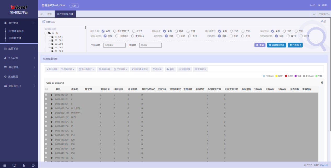 該功能提供電能表批量通斷電、設(shè)置下發(fā)、狀態(tài)篩選、下發(fā)和查詢操作。可對指定的某戶或多戶同時進行“電價設(shè)置”、“惡性負載”、“預(yù)付費模式”、“強制控制”、“定時通斷”、“基礎(chǔ)電量下發(fā)”、“初始化”、“清零”、“短信設(shè)置”、“空調(diào)復(fù)位”等操作。