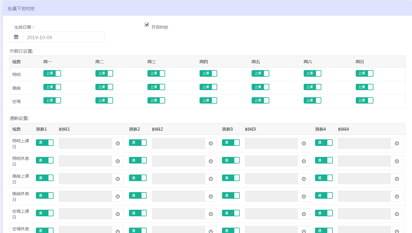 設(shè)置工作日和節(jié)假日宿舍每天用電通斷時間,最多支持八個時間段,三路可以單獨設(shè)置。