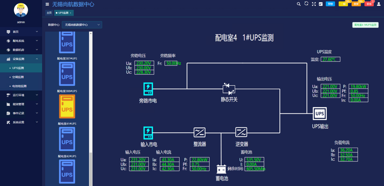 系統(tǒng)可以展示精密配電柜內(nèi)進(jìn)線和饋線回路電氣參數(shù),包括電流電壓功率電能以及開關(guān)狀態(tài),并可以對(duì)數(shù)據(jù)進(jìn)行報(bào)警設(shè)置和分級(jí),數(shù)據(jù)取自精密配電柜測(cè)量模塊。