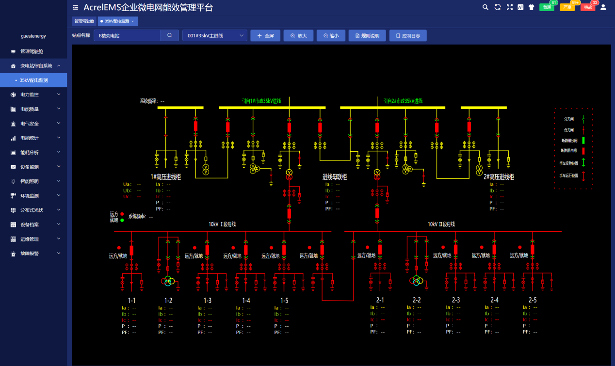 系統(tǒng)人機(jī)界面友好,以配電一次圖的形式直觀顯示配電線路的運(yùn)行狀態(tài),實(shí)時(shí)監(jiān)測(cè)各回路電壓、電流、功率、功率因數(shù)、電能等電參數(shù)信息,動(dòng)態(tài)監(jiān)視各配電回路斷路器、隔離開關(guān)、地刀等合分狀態(tài)、柴油發(fā)電機(jī)狀態(tài)、柴油液位、UPS狀態(tài)、電池信息等,以及有關(guān)故障、告警等信號(hào)。
