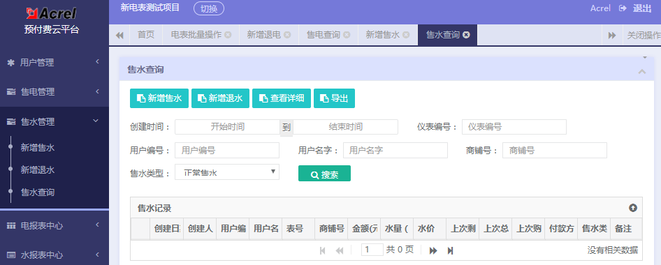 系統(tǒng)提供了新增售水、充正、退電,明細(xì)及分類查詢。