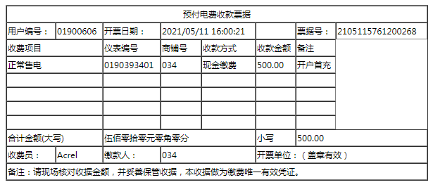 售電、退電、開戶時(shí)系統(tǒng)支持三聯(lián)單單據(jù)打印的功能,單據(jù)格式默認(rèn)如下(可以由客戶確認(rèn)后自由定制):
