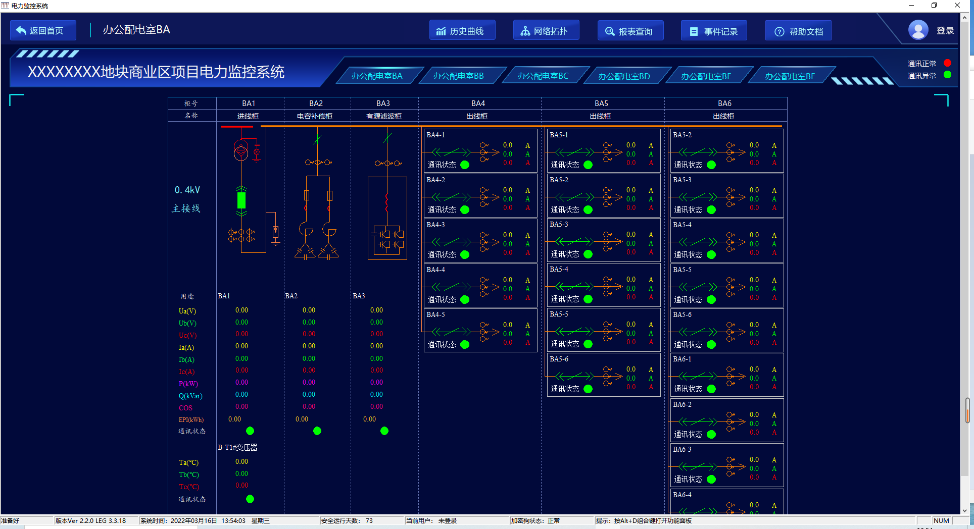 系統(tǒng)人機界面友好,以配電一次圖的形式直觀顯示配電線路的運行狀態(tài),實時監(jiān)測各回路電壓、電流、功率、功率因數(shù)、電能等電參數(shù)信息,動態(tài)監(jiān)視各配電回路斷路器、隔離開關、地刀等合分狀態(tài)、柴油發(fā)電機狀態(tài)、柴油液位、UPS狀態(tài)、電池信息等,以及有關故障、告警等信號。