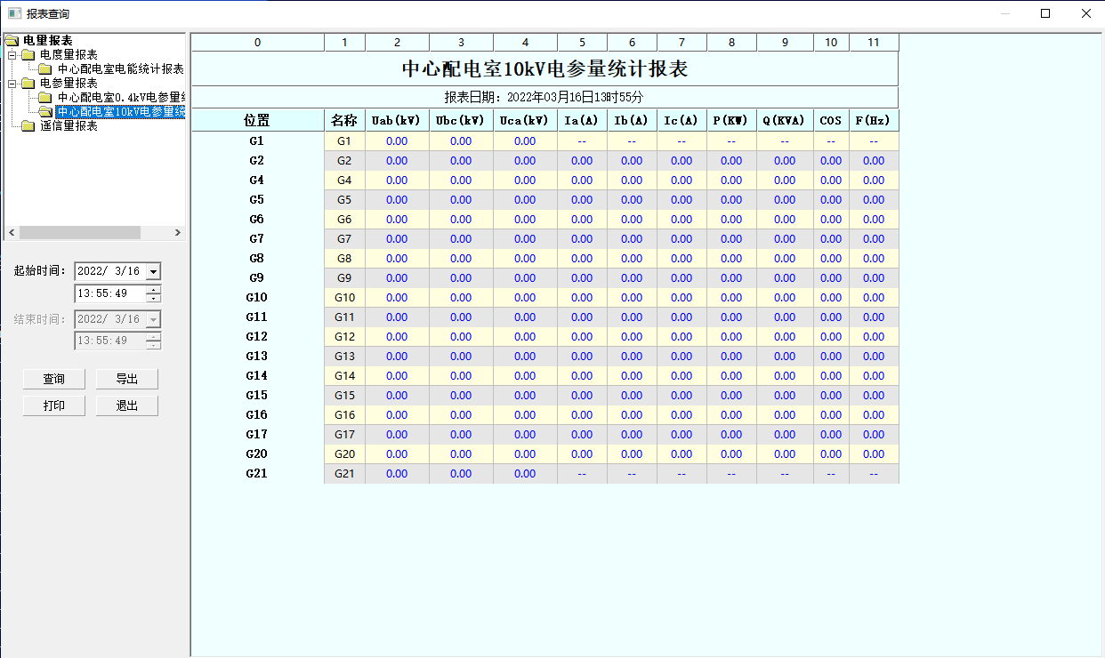 查詢各回路或設備指定時間的運行參數(shù),報表中顯示電參量信息應包括:各相電流、三相電壓、總功率因數(shù)、總有功功率、總無功功率、正向有功電能等.