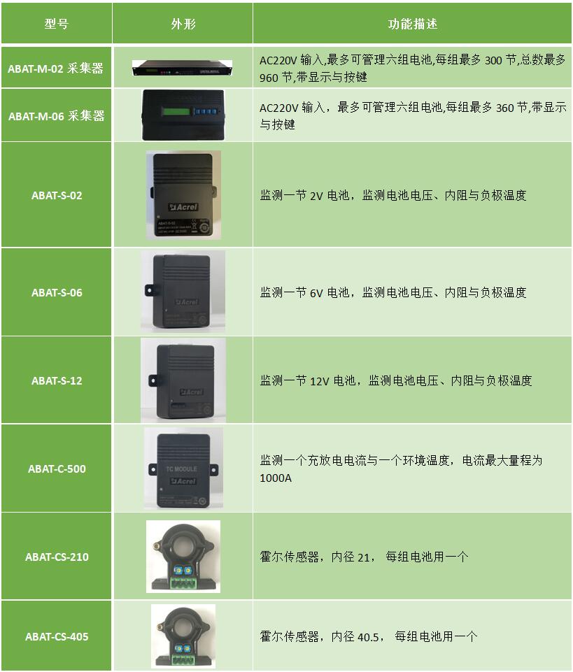 該系統(tǒng)具有監(jiān)測(cè)電池的電壓、內(nèi)阻與內(nèi)部溫度功能,安裝、維護(hù)與接入非常方便。系統(tǒng)主要由ABAT-S模塊、ABAT-C模塊及ABAT-M采集器組成,可通過(guò)采集器查詢(xún)告警與實(shí)時(shí)數(shù)據(jù)、設(shè)置參數(shù)等,可選配監(jiān)測(cè)平臺(tái)實(shí)現(xiàn)網(wǎng)絡(luò)化集中管理。